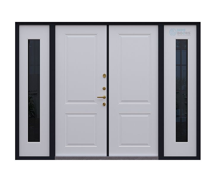 Дизайн двери выполнен в классическом стиле с декоративными панелями и чёткими линиями, что гармонично сочетается с различными фасадами. Боковые остеклённые фрамуги наполняют прихожую естественным светом, делая пространство светлее и визуально шире.