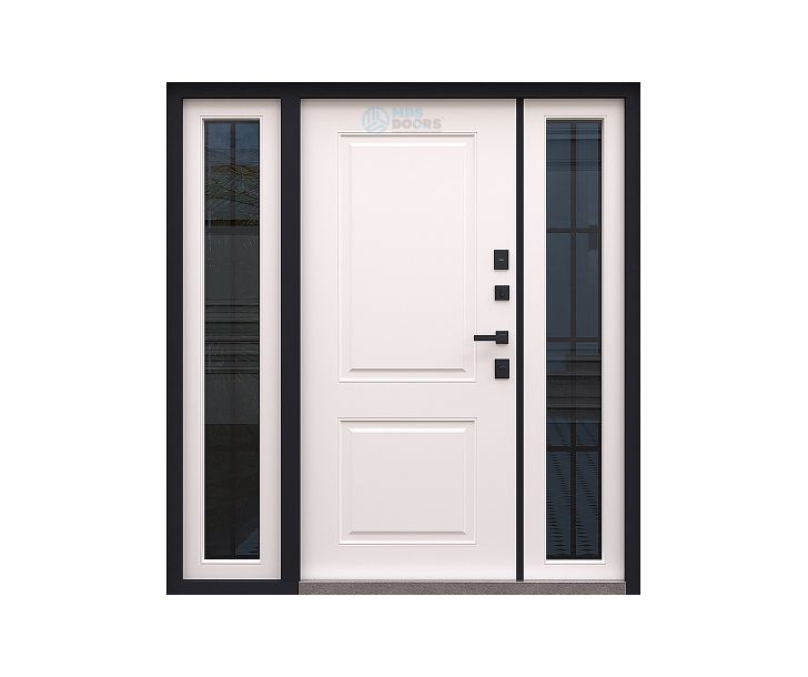 Модель выполнена из прочного металла и дополнена боковыми фрамугами со стеклянными элементами, обеспечивающими дополнительное естественное освещение и современный внешний вид входной зоны.