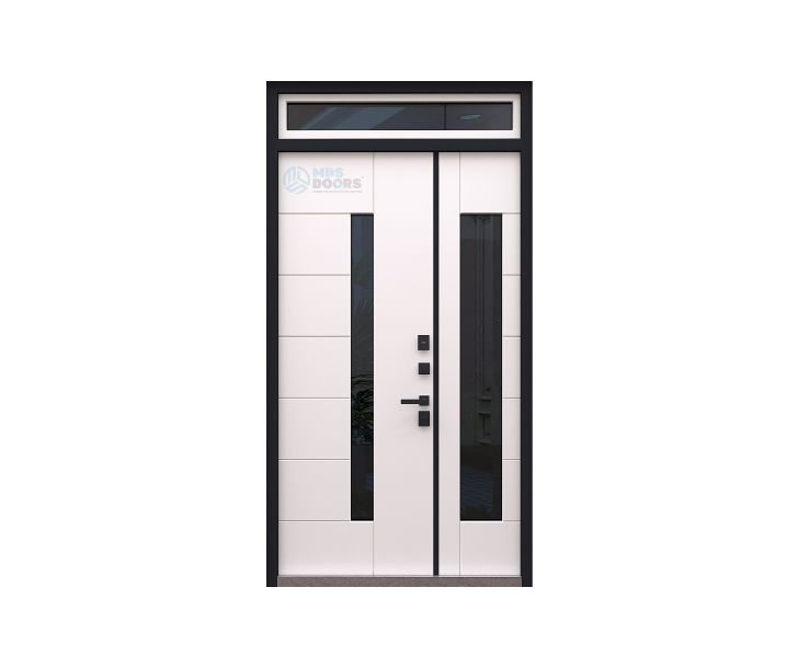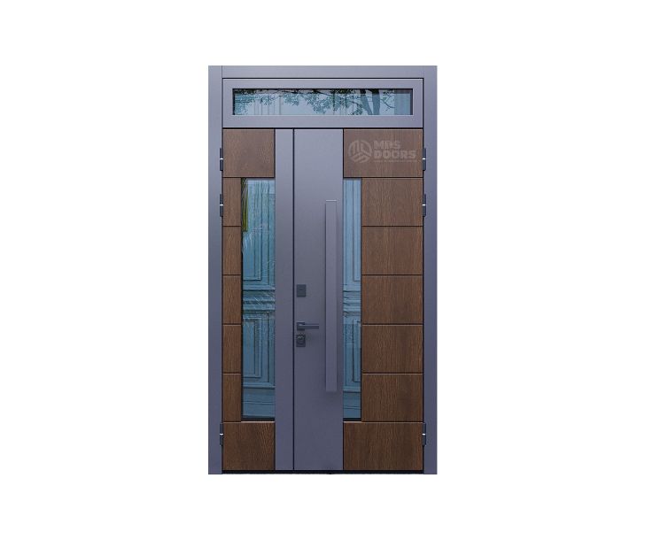 Модель выполнена из прочного металла с декоративными панелями, вертикальными стеклянными вставками и верхней фрамугой. Такое решение обеспечивает дополнительное естественное освещение и создаёт современный архитектурный вид входной зоны.