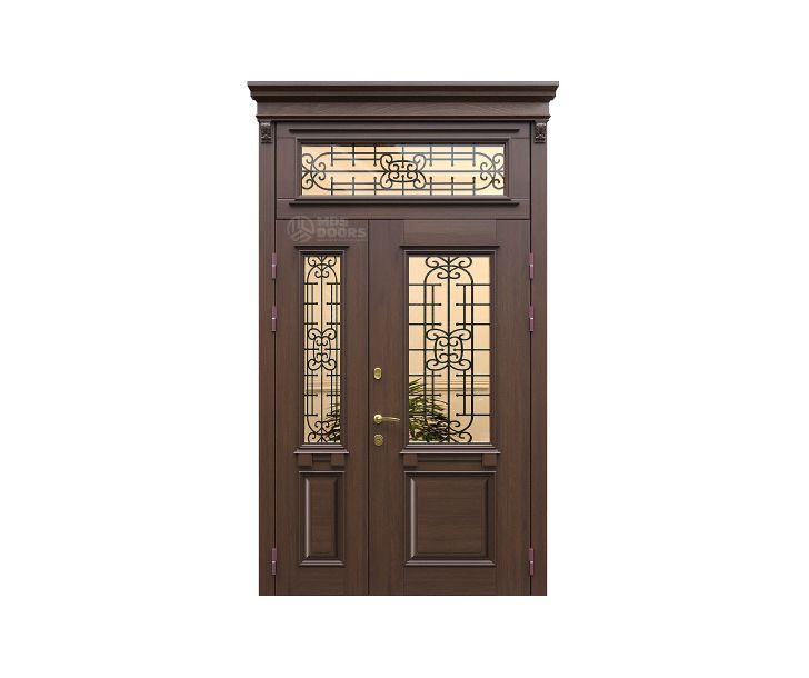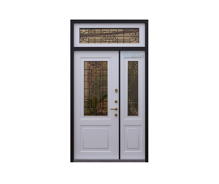 Модель выполнена из прочного металла и дополнена верхней фрамугой со стеклянными декоративными элементами. Такое решение обеспечивает дополнительное естественное освещение и создаёт элегантный архитектурный вид входной зоны.